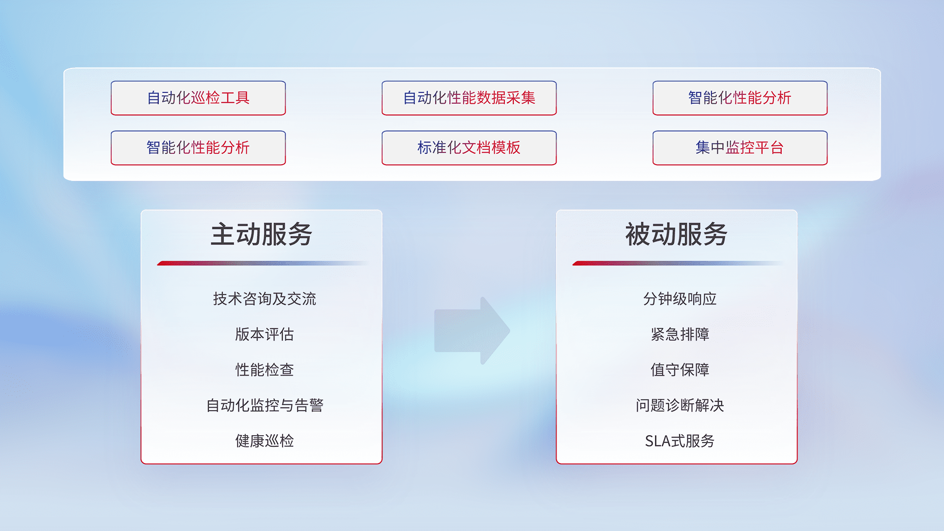 智能化工具和标准化文档,,,,保障服务质量,,,提供主动服务(包含技术咨询、、版本评估、、、性能检查、、、、自动化监控与告警、、、、健康巡检)和被动服务包含(分钟级响应、、、、紧急排障、、、值守保障、、问题诊断解决、、、、SLA服务)。。。